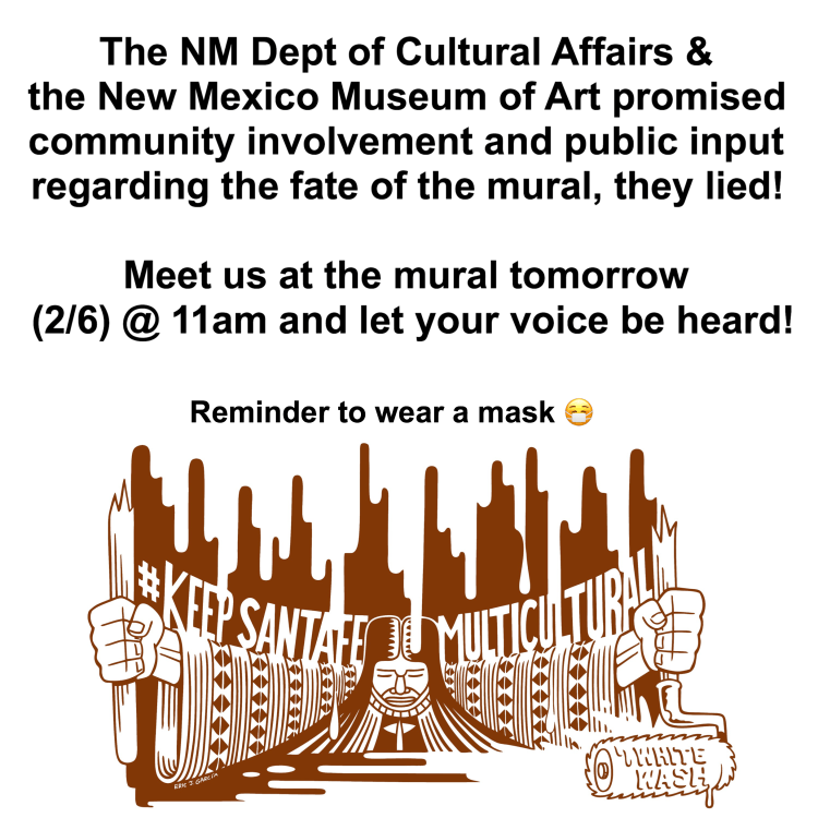 Last summer we met with Mark White, New Mexico Museum of Art Executive Director, via Zoom regarding the Multicultural mural. We are posting this video now because we think it is important for the community to know that they have continued to mislead and lie to us. They told us they want community involvement and we have requested a construction timeline multiple times. We were blindsided by the press release this week regarding construction beginning and the “retirement” of the Multicultural mural. The recording starts a little late into the meeting, the non-recorded beginning included introductions as well as presenting the results of the questionnaire we did. Also present at the meeting are Daniel Zillmann, NM DCA head of Marketing and Communications, as well as Cynthia Lawrence, the art conservator the state hired to review the mural.
